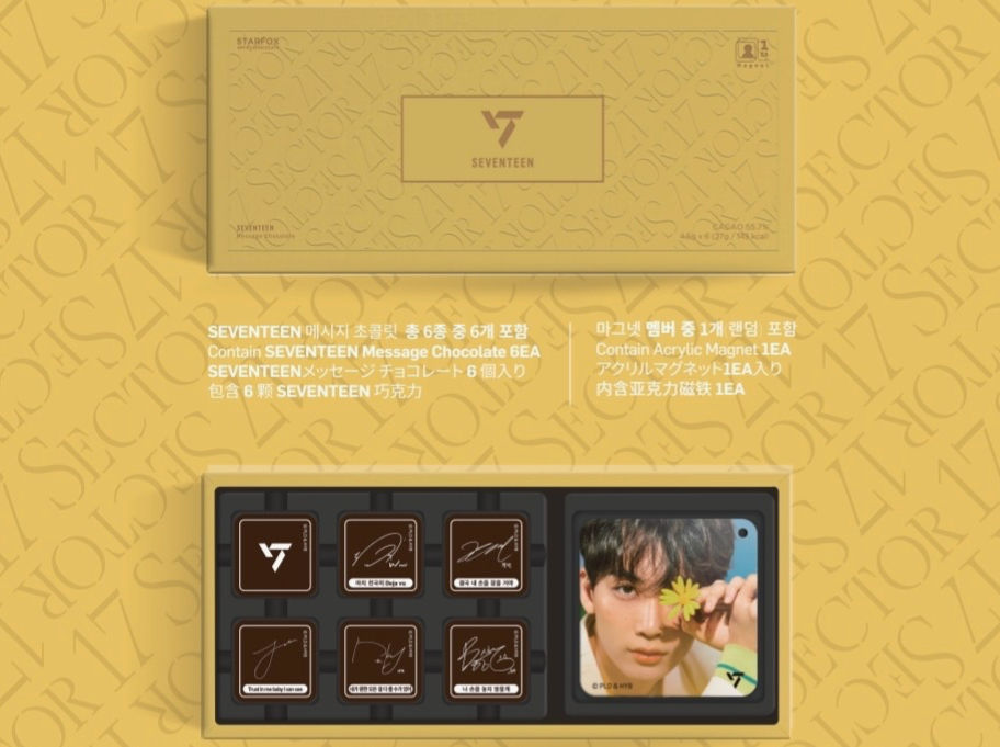 Delight in the sweetness of SEVENTEEN Message Chocolates, featuring heartwarming messages of hope and courage. Each box includes 6 delicious square chocolates and a collectible acrylic magnet, perfect for sharing or enjoying yourself. Spread positivity and love with these thoughtful treats from SEVENTEEN!